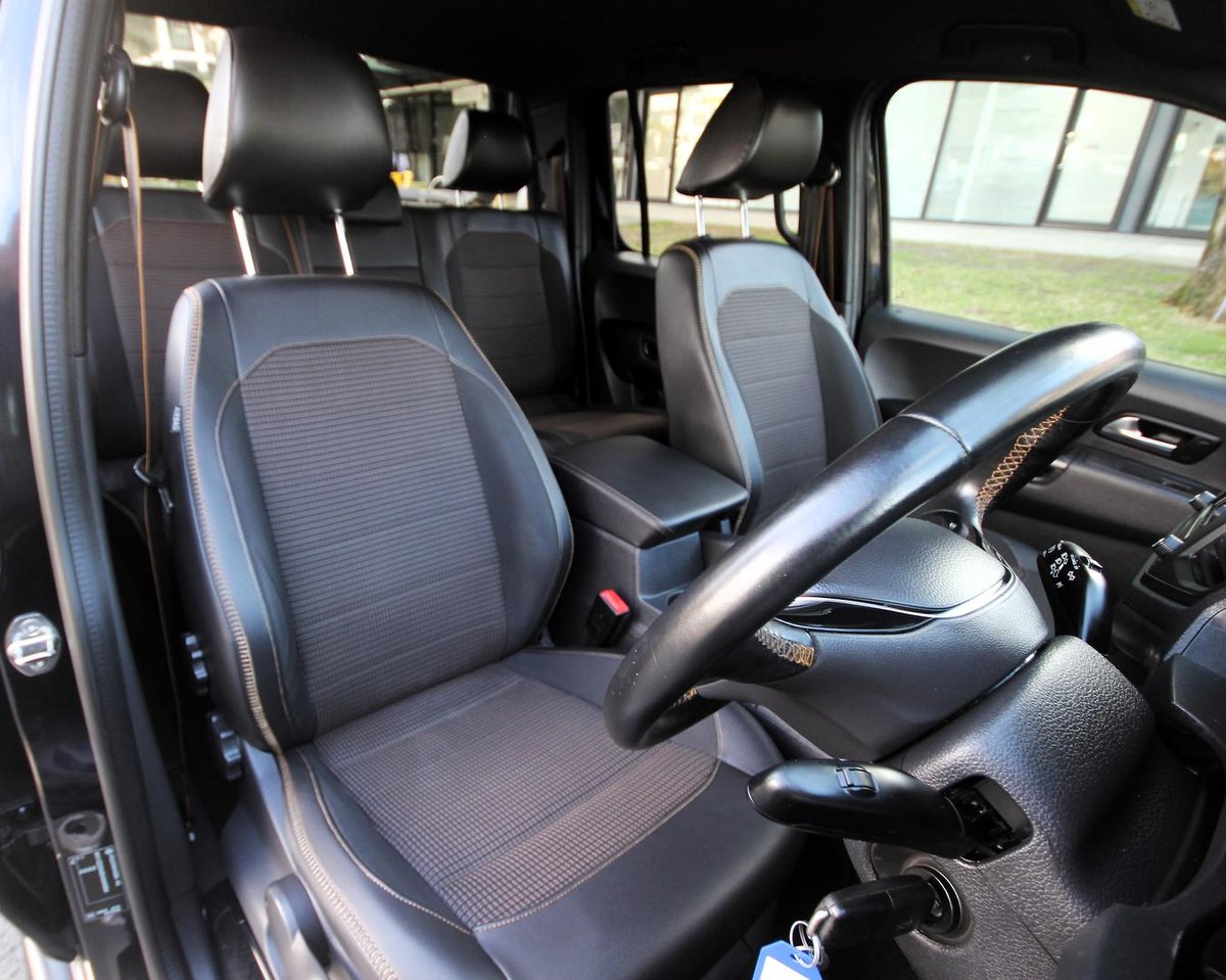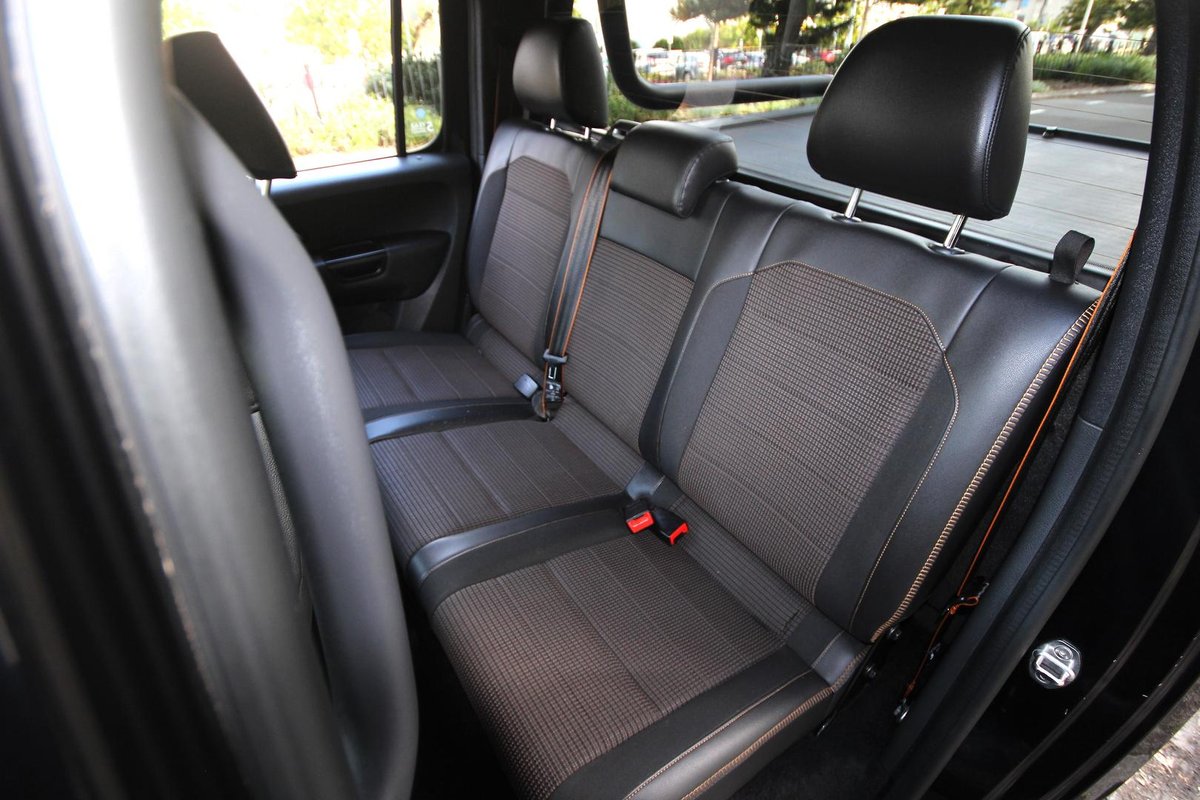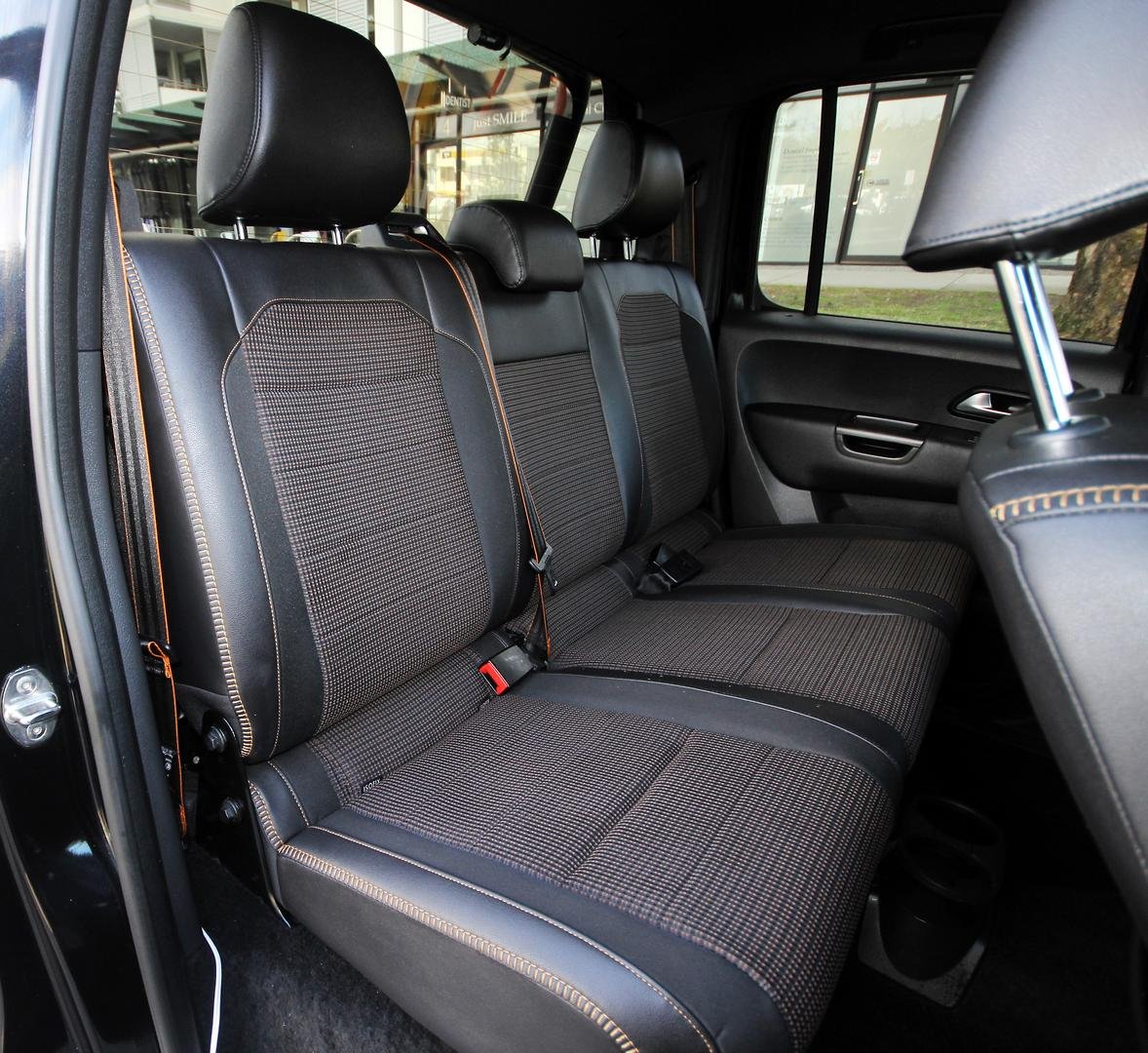 - Seats have partial leather, finished with distinctive orange stitching